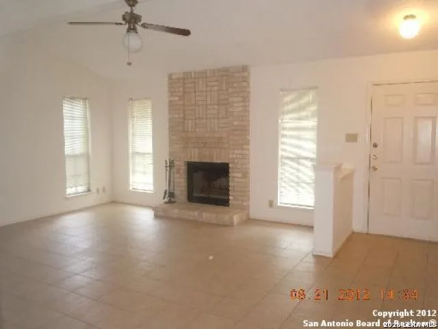 Located in the well-established Apple Creek subdivision, this cozy one-story home offers comfort and space. The living area features ceramic tile, high ceilings, and a floor-to-ceiling brick fireplace that creates a warm focal point for relaxing evenings. A formal dining room provides the perfect setting for gatherings, while the kitchen offers ample cabinet and countertop space for everyday cooking and entertaining. The primary suite includes a sitting area ideal for reading or unwinding, along with a ceiling fan for added comfort and carpeting. The en-suite bath features a double vanity, tub/shower combo, and a walk-in closet. Step outside to an oversized backyard with mature trees, a privacy fence, and a patio slab ready for weekend barbecues. Conveniently located near major highways, USAA, the Medical Center, UT Health Science Center, shopping, and dining. **Make ready to be completed!